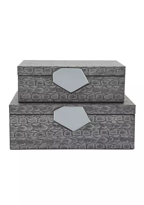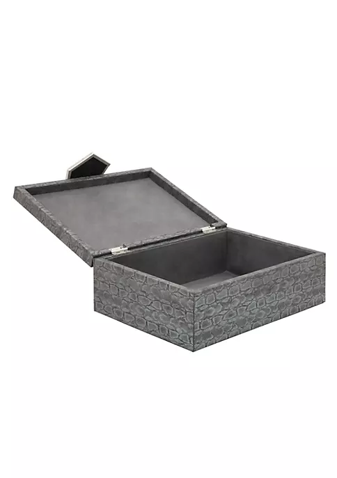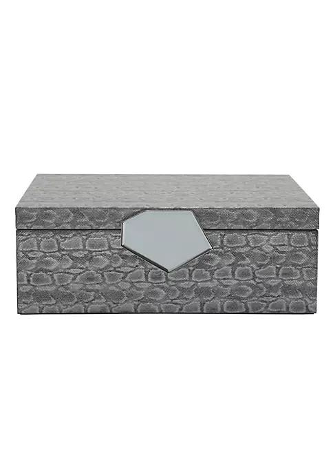 This impressive rectangular decor box will add a touch of elegance to any console table or entryway display. Crafted in wood it is upholstered in a beautiful gray faux leather material with a snake-skin pattern. Use it to store items of value and small treasures or gift it to someone on a special day.