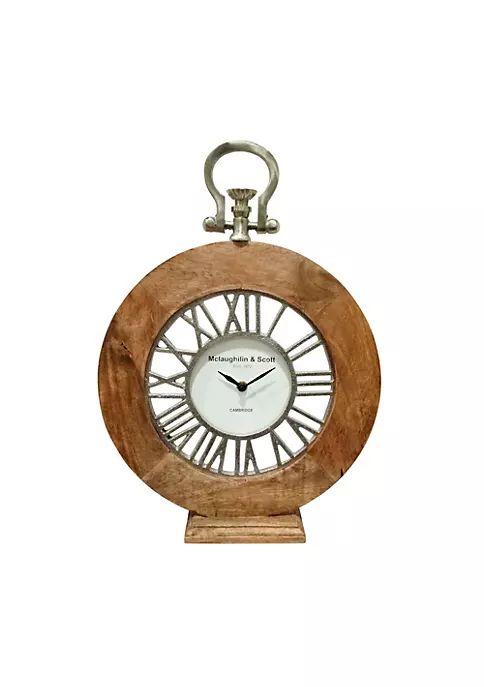 Surprise your friends and family by introducing this elegant round table clock. Made in mango wood it defines a natural appeal. Revealing an enticing design it displays Roman numerals. The decorative metal handle on top adds to the creative touch. It will be an ideal choice for your home or office decor. This beautiful table clock will also be a suitable gift for your loved ones.